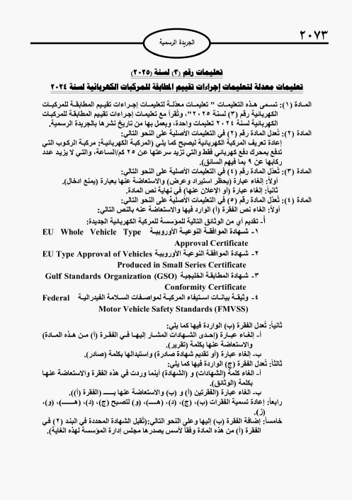 قررت الحكومة بحسب ما ورد في الجريدة الرسمية، إجراء تعديلات على تعليمات إجراءات تقييم المطابقة للمركبات الكهربائية لسنة ٢٠٢٤