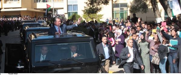 واحتشد طلبة الجامعة في الساحات للترحيب بجلالة الملك الذي شاركهم احتفالهم بالذكرى الخمسين لتأسيس جامعتهم.