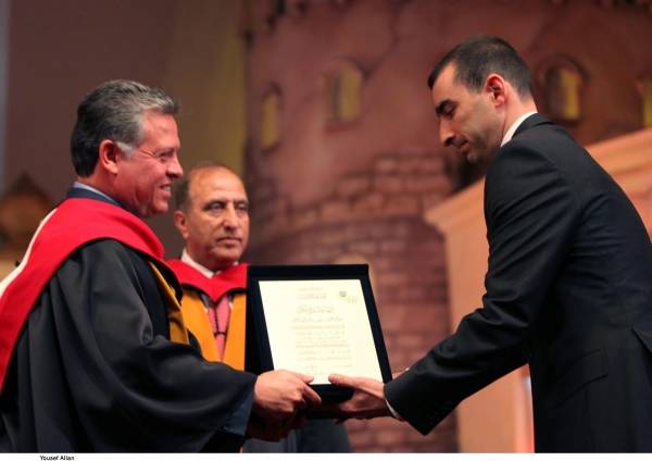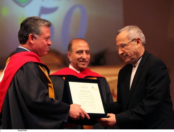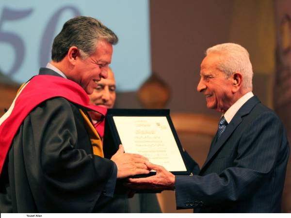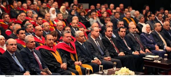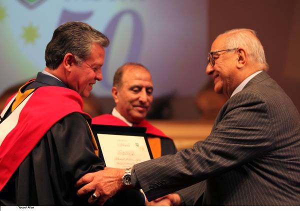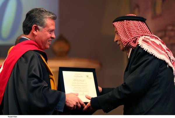 وكرم جلالة الملك رؤساء مجالس الجامعة الاردنية السابقين وهم المرحوم سمير الرفاعي وتسلم التكريم ابنه زيد الرفاعي، والمرحوم سعيد المفتي وتسلم التكريم حفيده طارق المفتي، والدكتور احمد اللوزي والدكتور عبدالسلام المجالي، والدكتور كامل العجلوني والدكتور خالد طوقان.