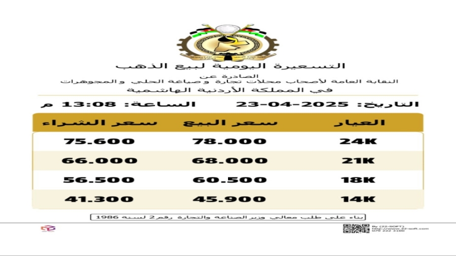 وبحسب التسعيرة، بلغ عيار 21 بلغ 68 دينارا، بينما بلغ سعر الشراء 66 دينارا للغرام.
