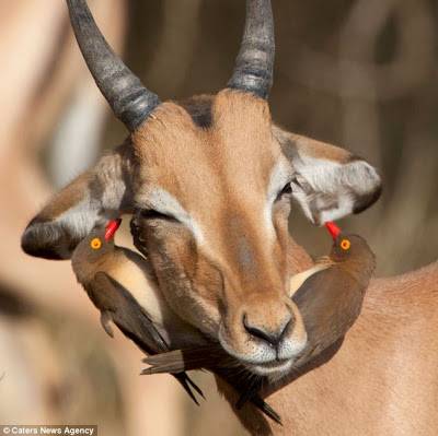 الغزال سعيد بوجود الطيورلان هذه الطيور تقوم بالتغذية على الحشرات وخاصة القراد والطفيلياتوالقمل وتحافظ على فروالغزال نظيفا
