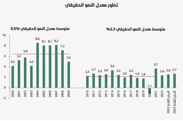 وكشفت خلاصة التقرير، أن الاقتصاد الوطني تعرض لتداعيات الأزمة المالية والاقتصادية العالمية في عام 2009 وحالة عدم الاستقرار الأمني في المنطقة عام 2011 وما تبعها من تدفق لأكثر من مليون لاجئ سوري للمملكة، والتي – بحسب التقرير – أدت إلى ضغوط على المالية العامة والخدمات الحكومية الأساسية مثل الصحة والتعليم والنقل والمياه وخدمات الصرف الصحي وغيرها، إضافة الى تداعيات الاغلاقات التي شهدها العالم عام 2020 بسبب جائحة كورونا، والذي تسبب بتباطأ معدل النمو الاقتصادي خلال الفترة (2010-2022) بحيث لم يتجاوز 2.2% بالمتوسط.