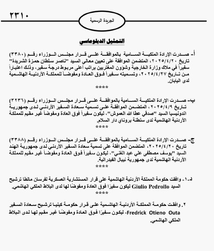 صدرت الإرادة الملكية السامية، في عدد الجريدة الرسمية اليوم الأربعاء، بالموافقة على قرار مجلس الوزراء المتضمن الموافقة على تعيين عدد من السفراء.