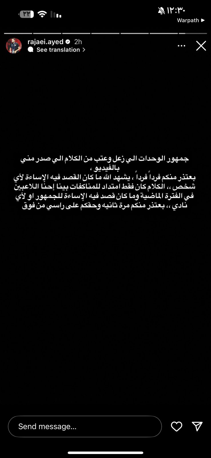 بعتذر منكم فردا فردا ، يشهد الله ما كان القصد فيه الإساءة لأي شخص ،، الكلام كان فقط امتداد للمناكفات بينا إحنا اللاعبين في الفترة الماضية وما كان قصد فيه الإساءة للجمهور او لأي نادي ،، بعتذر منكم مرة ثانيه وحقكم على راسي من فوق".