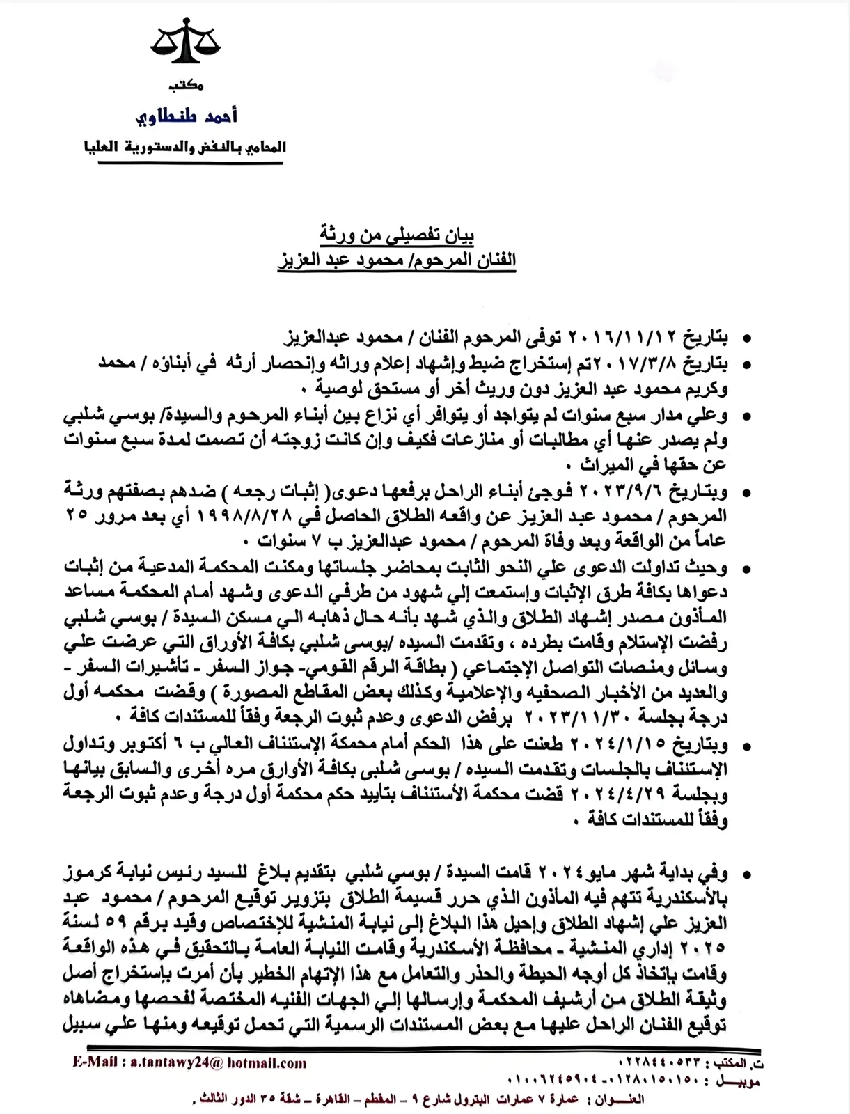 وأشار الورثة إلى أن بوسي شلبي لم تفتح أي نزاع قانوني أو مطالبة بالميراث طوال سبع سنوات؛ مما يطرح تساؤلات حول مدى أحقيتها في الدعوى التي رفعتها لاحقًا.