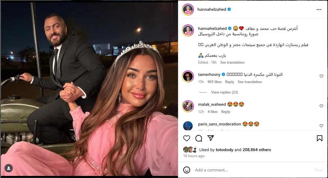 وظهرت هنا في الصورة وهي تجلس بجانب تامر حسني داخل "تروسيكل"، وعلّقت عليها بطرافة إذ قالت: "أشرس قصة حب محمد وعفاف... صورة رومانسية من داخل التروسيكل... فيلم "ريستارت" النهارده في جميع سينمات مصر والوطن العربي... يا رب يعجبكم".