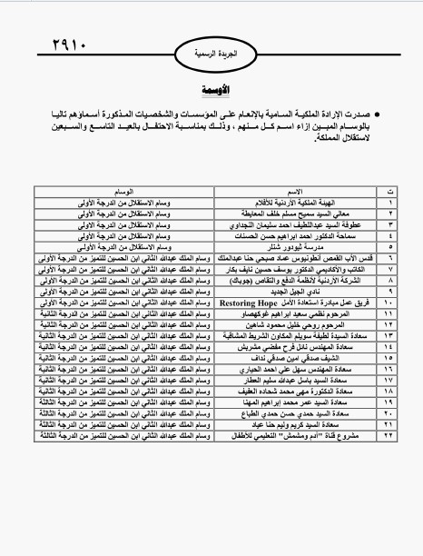 جفرا نيوز - صدرت الإرادة الملكية السامية في عدد الجريدة الرسمية اليوم الأحد، بالإنعام على مؤسسات وشخصيات بعدد من الأوسمة؛ وذلك بمناسبة الاحتفال بالعيد التاسع والسبعين لاستقلال المملكة.