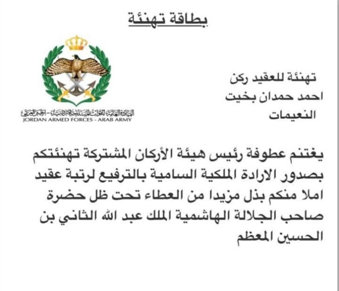 تتقدم مدير الإعلام والاتصال الناطق الإعلامي لوزارة الطاقة والثروة المعدنية ليندا النعيمات، باجمل ايات التهنئة والتبريكات لشقيقها أحمد حمدان النعيمات الى رتبة عقيد ركن في القوات المسلحة الأردنية- الجيش العربي.