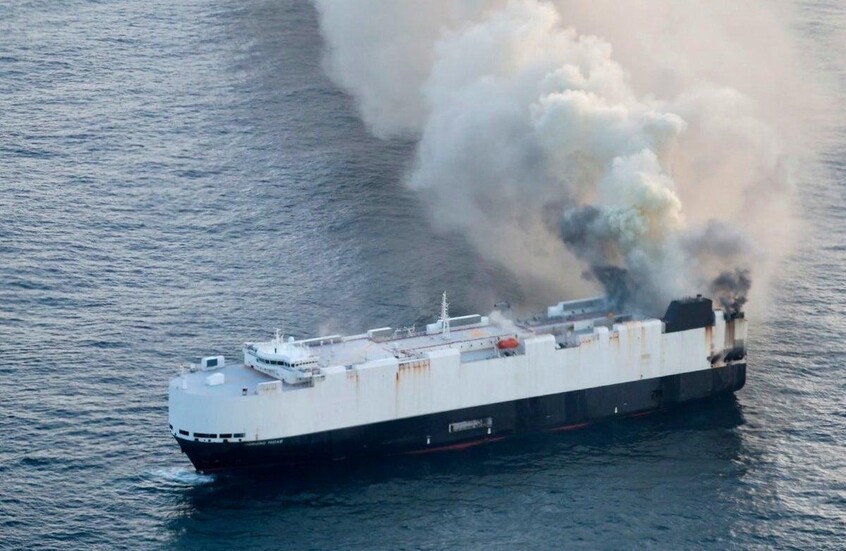 وكانت السفينة التي ترفع علم ليبيريا تحمل 3000 مركبة، بينها 800 سيارة كهربائية، عندما لوحظ تصاعد الدخان من سطحها.