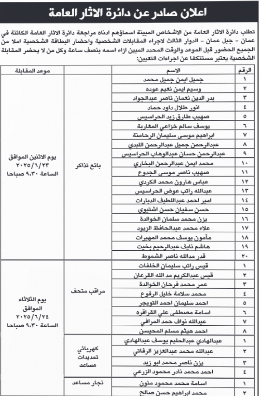 أعلنت عدد من المؤسسات الحكومية، اليوم الأربعاء، عن شواغر وظيفية، فيما دعت مؤسسات أخرى عددا من المرشحين لإجراء المقابلات الشخصية، وتاليًا التفاصيل: