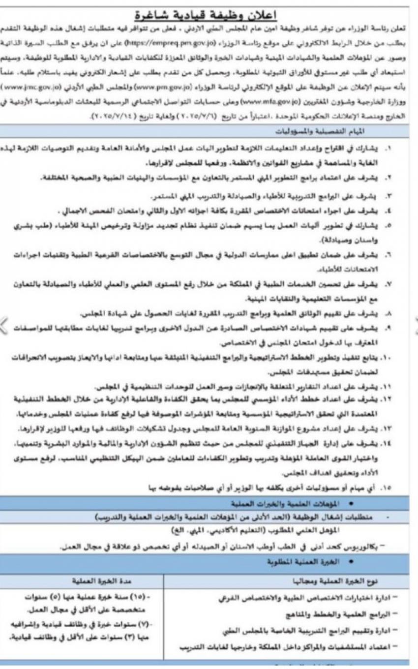 أعلنت رئاسة الوزراء اليوم الأحد، عن توفر شاغر وظيفة أمين عام المجلس الطبي الأردني.
