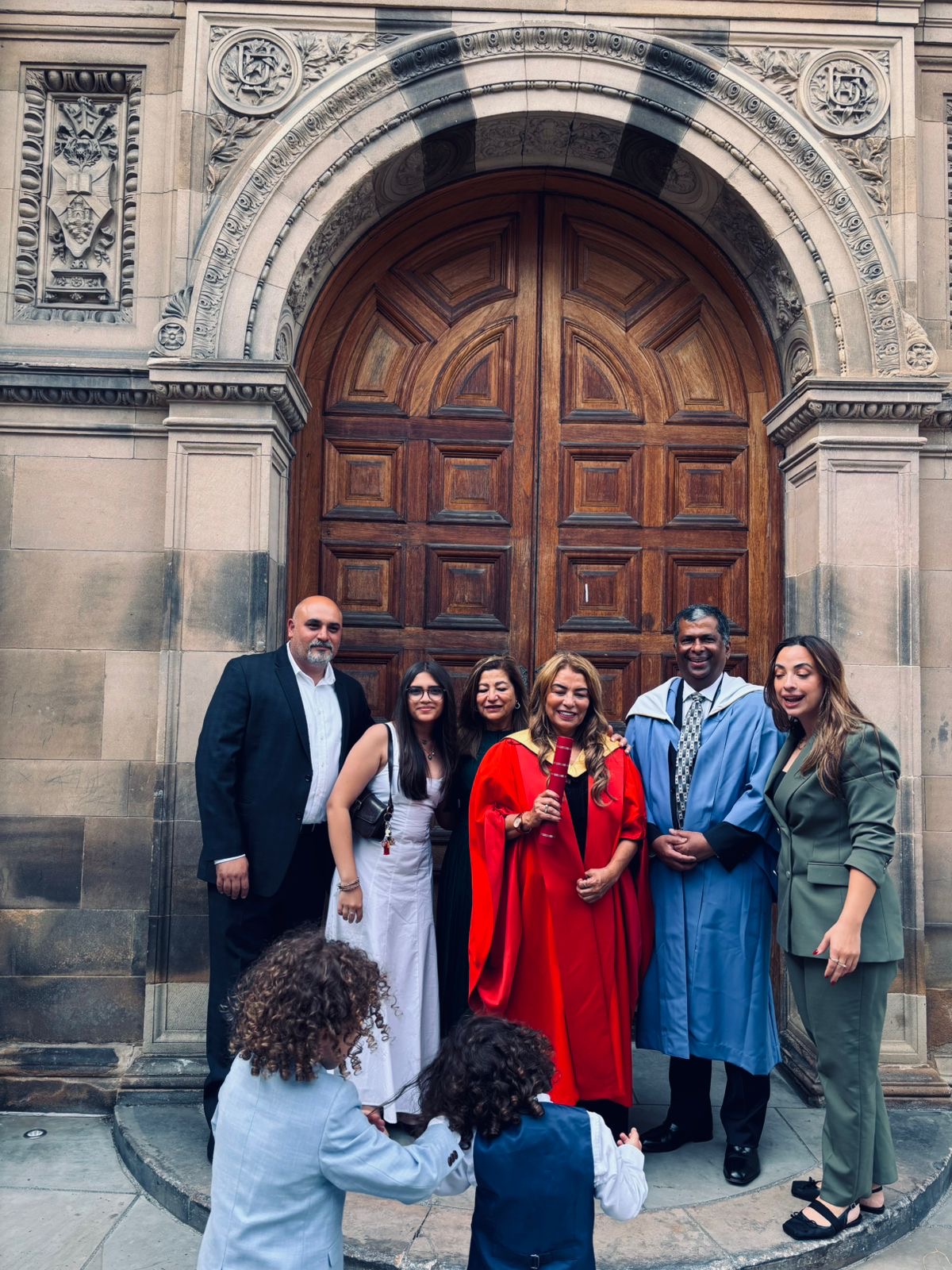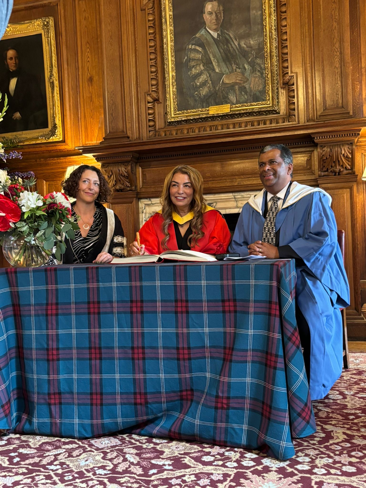 وتابعت: ما زلت أتذكر نصيحة والدي: "عليكِ أن ترفعي رأسك دائمًا"، وذلك بالحفاظ على الكرامة والنزاهة واحترام الذات في أفعالك. أبي، لقد عشت وفقًا لقيمك، ونتيجة لذلك، يشرفني الآن الوقوف هنا اليوم في جامعة إدنبره، محاطةً بهذا المجتمع الرائع من المتعلمين والقادة.