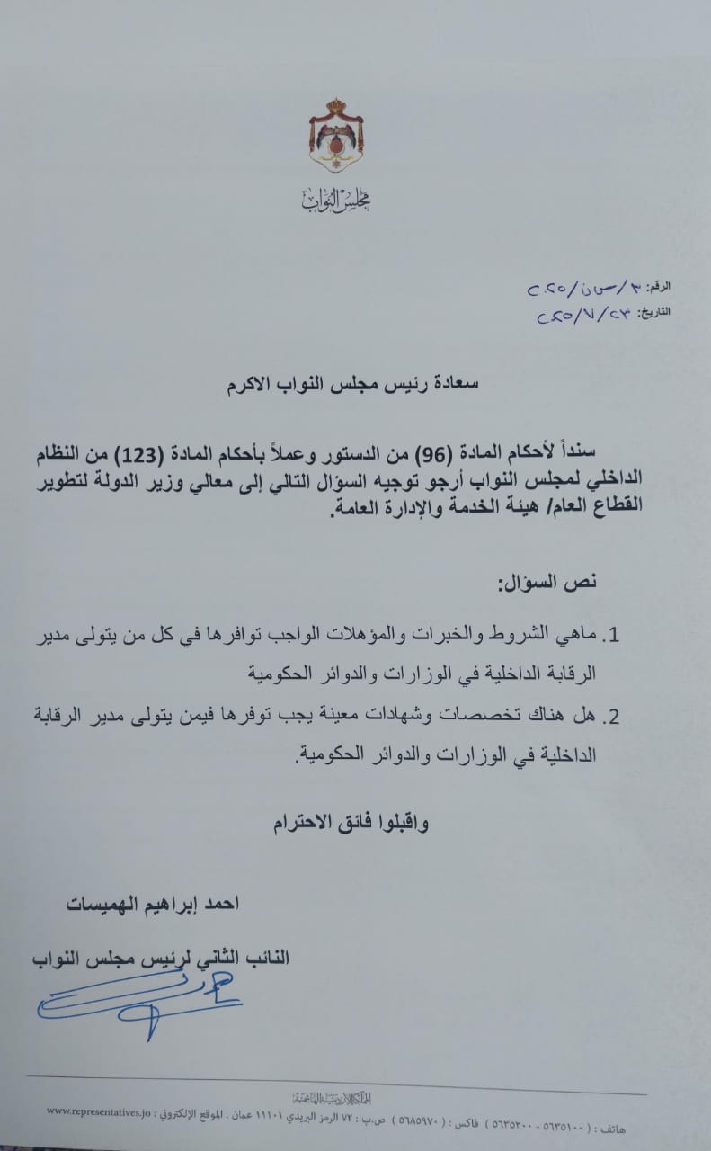 جفرا نيوز - وجه النائب الثاني لرئيس مجلس النواب أحمد الهميسات، سؤالًا إلى وزير الدولة لتطوير القطاع العام، حول الشروط والخبرات والمؤهلات الواجب توافرها في كل من يتولى مدير الرقابة الداخلية في الوزارات والدوائر الحكومية.
