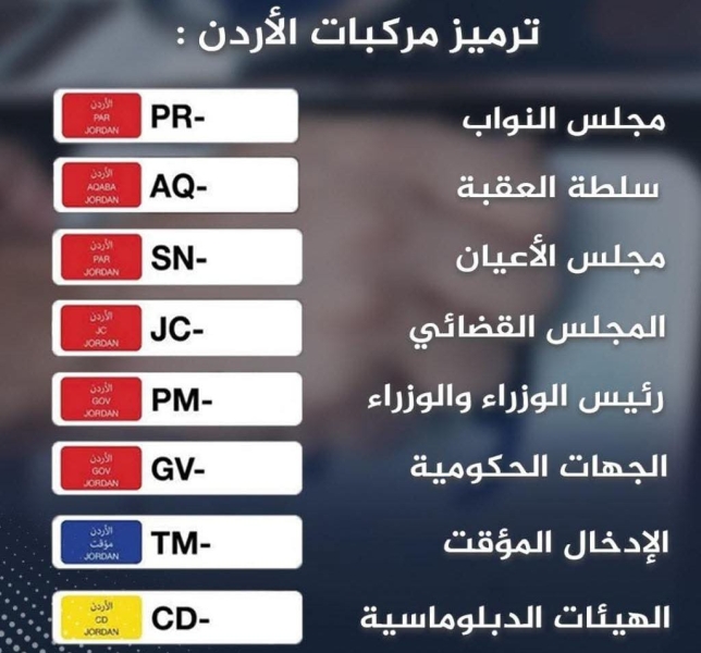 وبموجب التَّعديل، ستحمل لوحات المركبات الحكومية والإدخال المؤقت والدبلوماسية حروفاً واضحة تدل على الجهة التي تتبع لها المركبة وعلى النحو الآتي: رئيس الوزراء والوزراء الرمز PM، مجلس الأعيان SN، ومجلس النواب PR، والمجلس القضائي JC، والجهات الحكومية GV، وسلطة منطقة العقبة الاقتصادية AQ، والهيئات الدبلوماسية CD، والإدخال المؤقت TM.