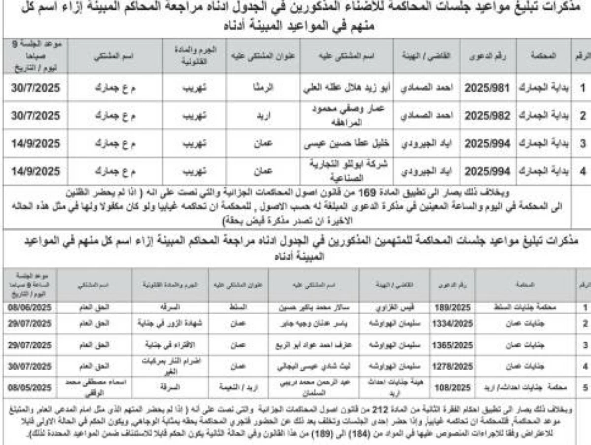 صدرت اليوم الاثنين، مذكرات تبليغ مواعيد جلسات المحاكمة لمشتكى عليهم ولمتهمين وقرارات امهال لحضور جلسات محاكمة.