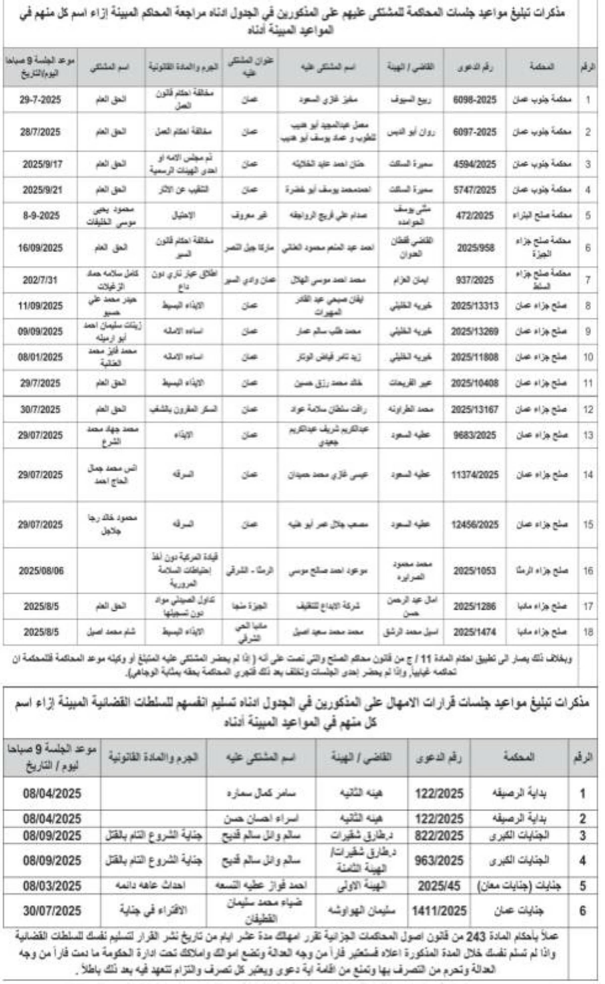 وطلبت المذكرات من المذكورين في الجداول أدناه مراجعة المحاكم المبينة ازاء اسم كل منهم في المواعيد المبينة أدناه.