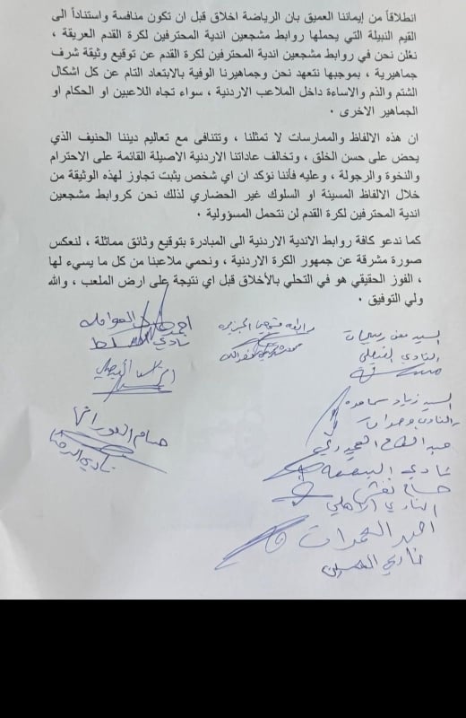 ودعت روابط الجماهير للتوقيع على وثيقة التزام أخلاقي تعكس الصورة الحقيقية للملاعب الأردنية، وأن يكون الفوز الحقيقي هو بالتحلي بالأخلاق قبل تحقيق أي نتيجة على أرض الملعب.
