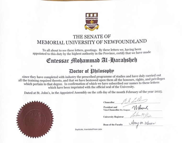 بـمـشـاعـر مليئـة بالفرحة والسرور يتقدم المهندس هاني محمد الحراحشه "أبو تاج" و العائلة من شقيقتهم الدكتوره إنتصار محمد الحراحشه بمناسبة حصولـها على درجة الدكتوراه من جامعة ميموريال -كندا في اللغة الإنجليزية بتخصص اللغات الأجنبية وبهذه المناسبة السعيدة، نسأل الله أن يبارك لكم.