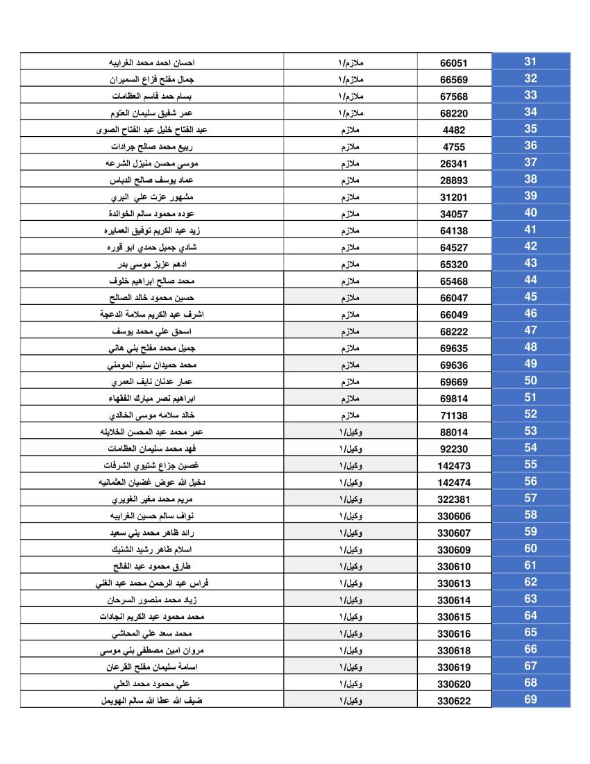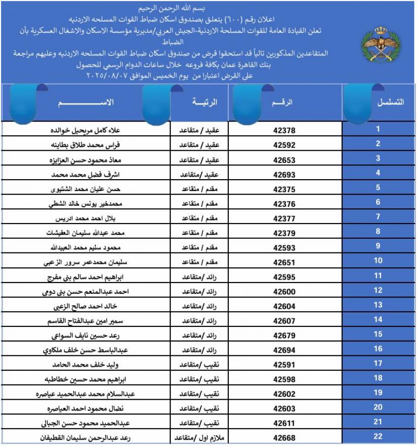 وقالت المديرية إنه على الضباط وضباط الصف والأفراد المبينة أسماءهم أدناه مراجعة بنك القاهرة عمان بكافة فروعه خلال ساعات الدوام الرسمي اعتباراً من يوم الخميس الموافق 07/08/2025 للحصول على القرض.