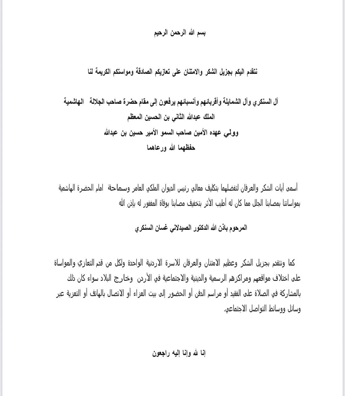 شكر على التعاز بوفاة الدكتور غسان السنكري