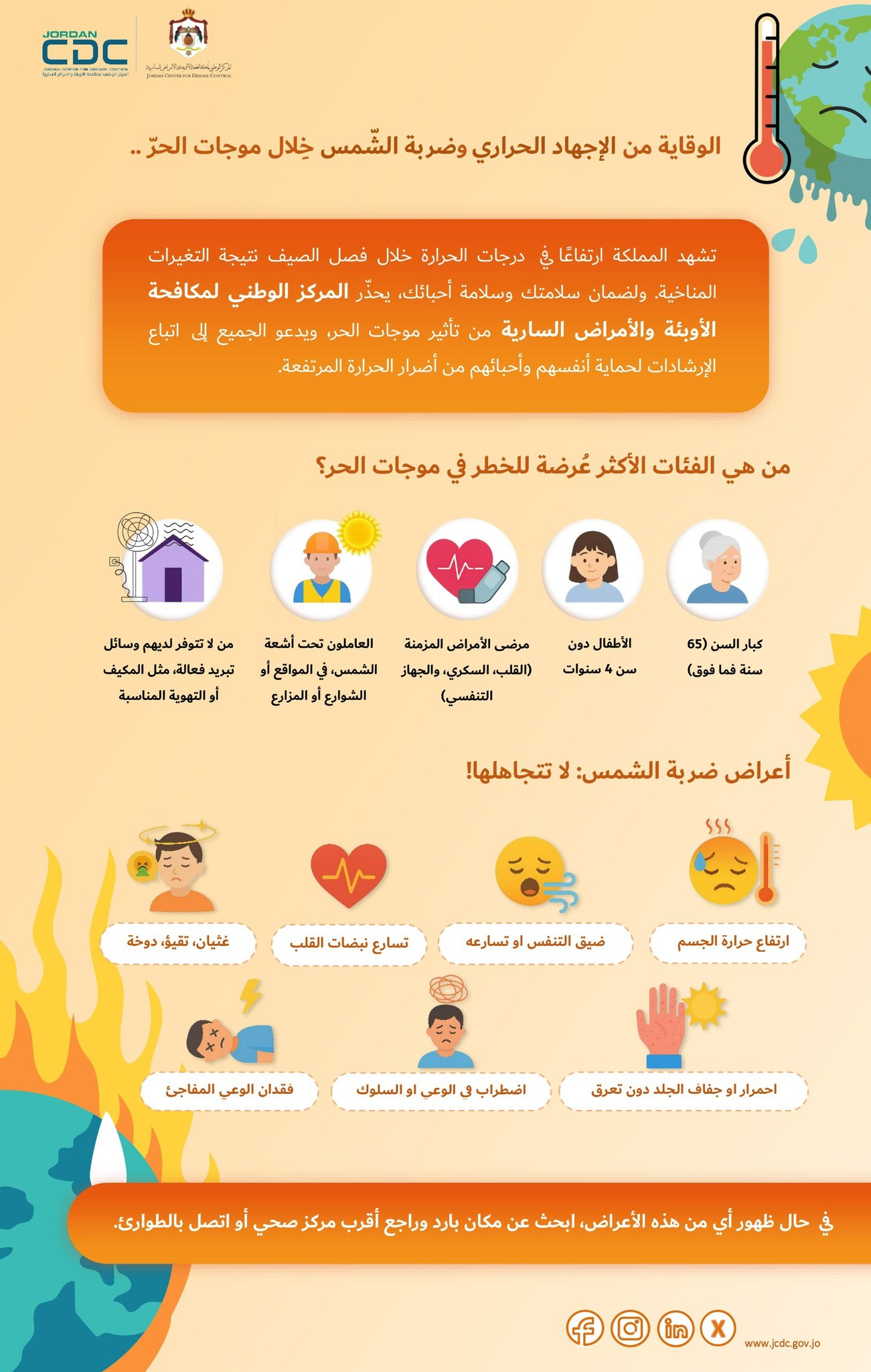 حذر المركز الوطني لمكافحة الأوبئة والأمراض السارية من تعرض المواطنين للإجهاد الحراري وضربات الشمس، خلال موجات الحر القادمة على المملكة.