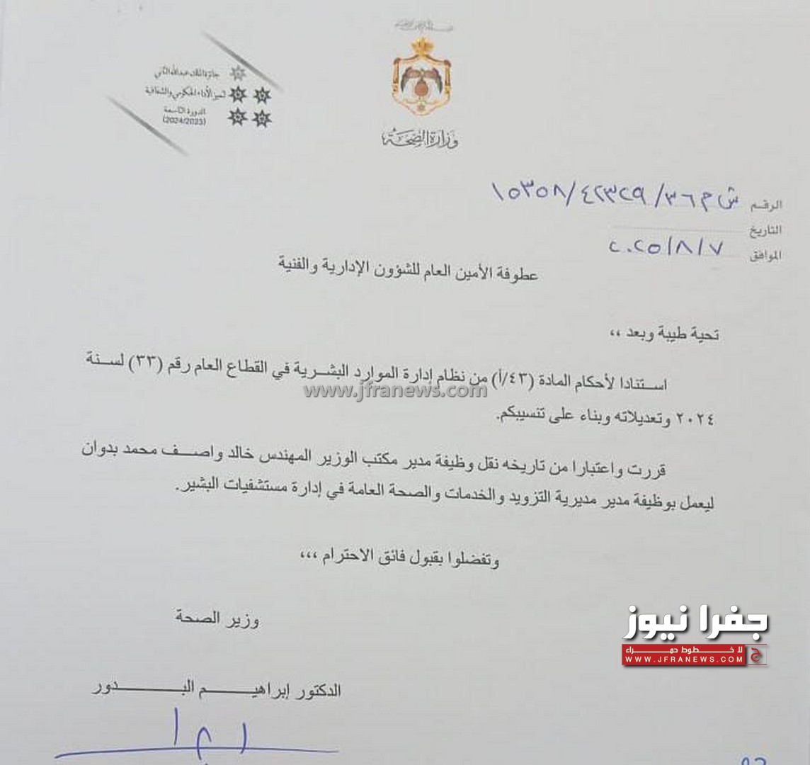 كما قرر الوزير تعيين السيد عمار السويطي مديرا لمكتبه، ونقل المدير السابق لتولي مهام مدير التزويد في مستشفيات البشير، وذلك في إطار عملية إعادة ترتيب الكوادر الإدارية بما ينسجم مع متطلبات المرحلة المقبلة.