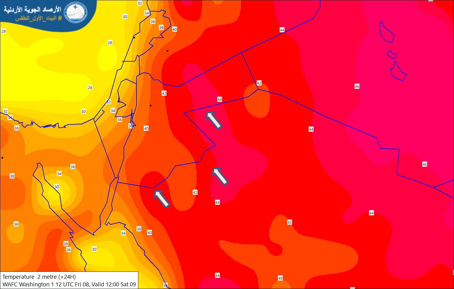 درجات الحرارة العظمى في عمّان خلال هذه الفترة تتراوح ما بين 40 و43 درجة مئوية، مع بقاء الأجواء حارة نسبيًا ليلًا.