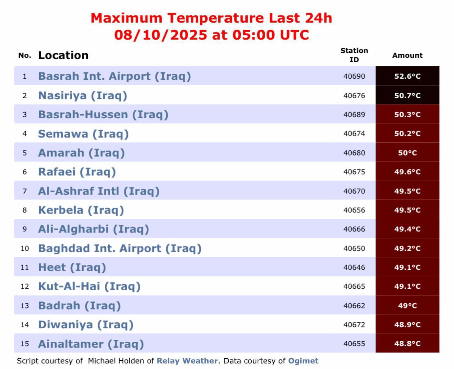 حقق العراق رقما قياسيا مقلقا، بعد أن هيمنت مدنه على قائمة أعلى 15 درجة حرارة مسجلة بالعالم (خلال 24 ساعة) في تاريخ 8 أغسطس 2025.