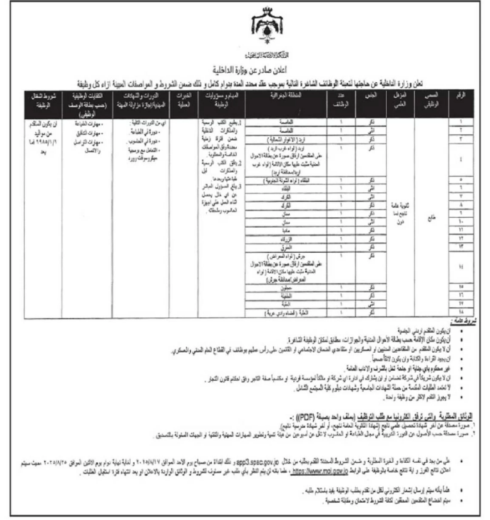 تعلن وزارة الداخلية عن حاجتها لتعبئة الوظائف الشاغرة بموجب عقد محدد المدة بدوام كامل وذلك ضمن الشروط والمواصفات المبينة ازاء كل وظيفة: