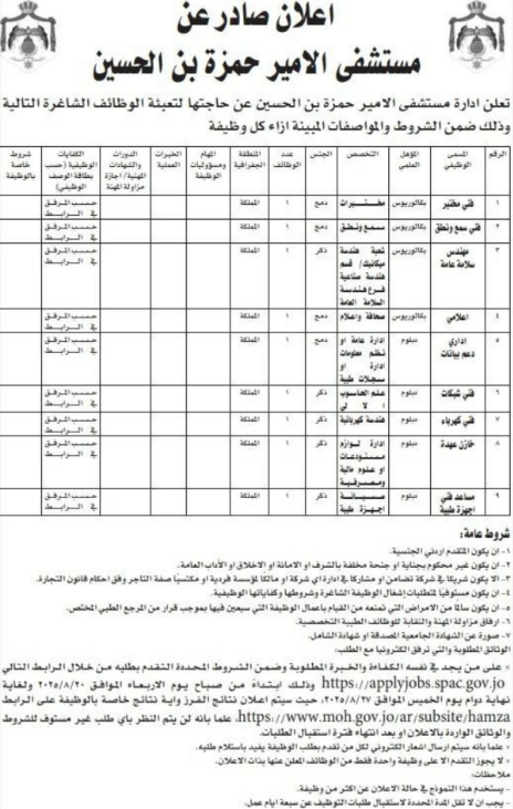تعلن ادارة مستشفى الامير حمزة بن الحسين عن حاجتها لتعبئة الوظائف الشاغرة التالية ، وذلك ضمن الشروط والمواصفات المبينة إزاء كل وظيفة: