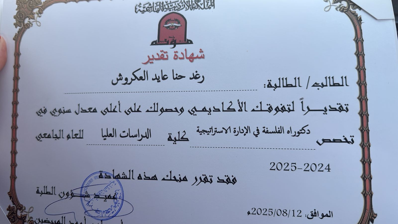 الاخوة والاخوات يهنئون شقيقتهم الدكتورة رغد عكروش بتفوقها الاكاديمي وحصولها على اعلى العلامات وحصولها على المرتبة الاولى في برنامج الدكتورة في الادارة الاستراتيجية في جامعة مؤته وتكريمها بشهادة تقدير من رئيس جامعة مؤتة الاستاذ الدكتور سلامة النعيمات ظهر اليوم .
