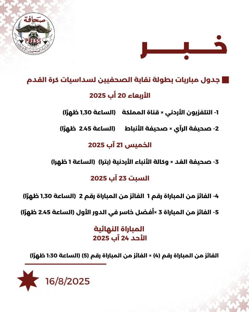 وتتواصل المباريات يوم غد الخميس عند الواحدة ظهرا، بلقاء يجمع فريقي وكالة الأنباء الأردنية (بترا) وصحيفة الغد، على أن تتواصل المباريات يوم السبت، فيما يقام الحفل الختامي يوم الأحد المقبل.
