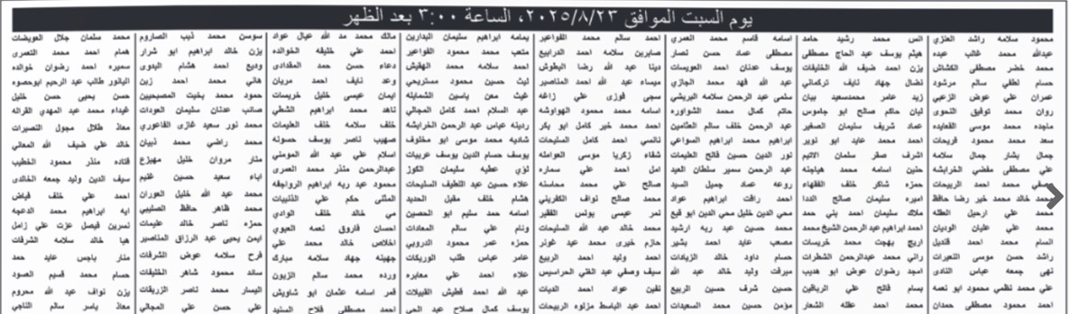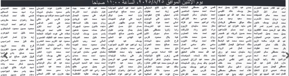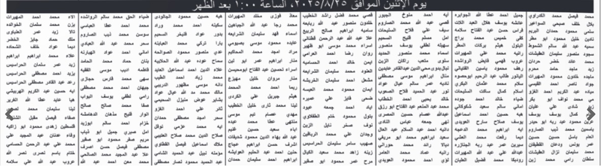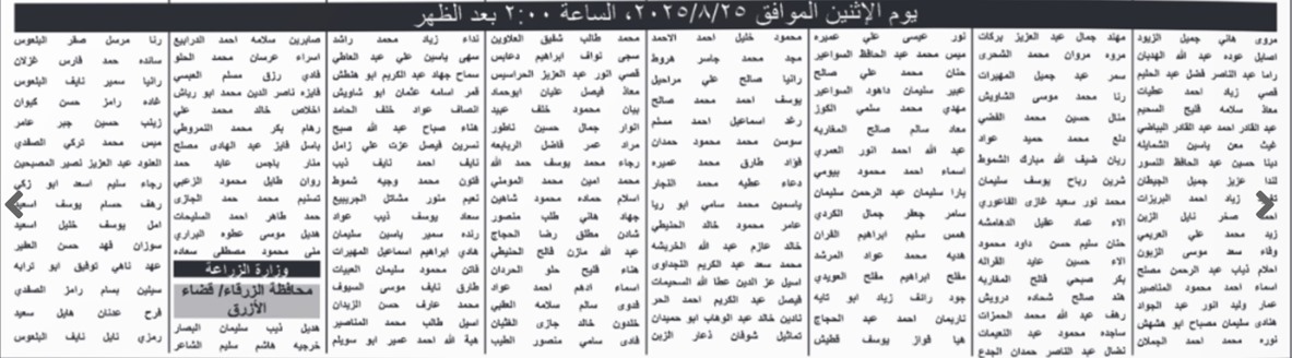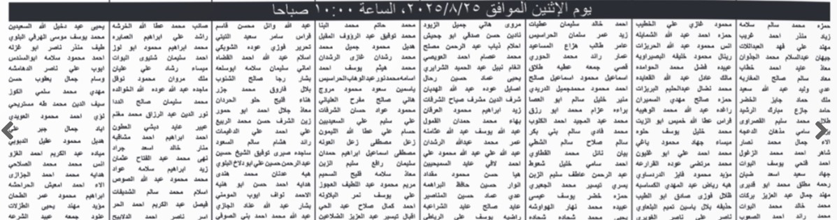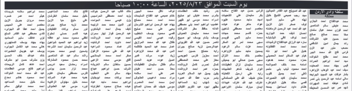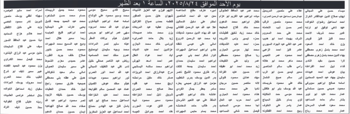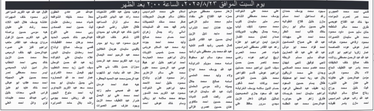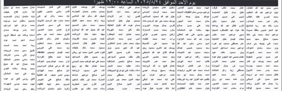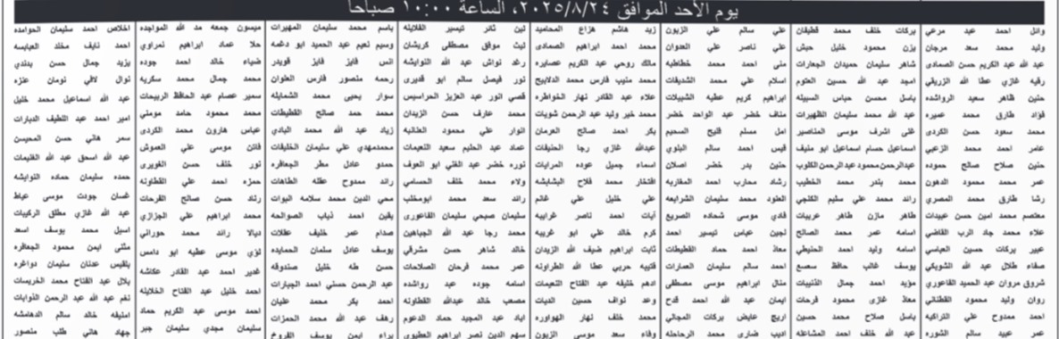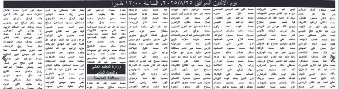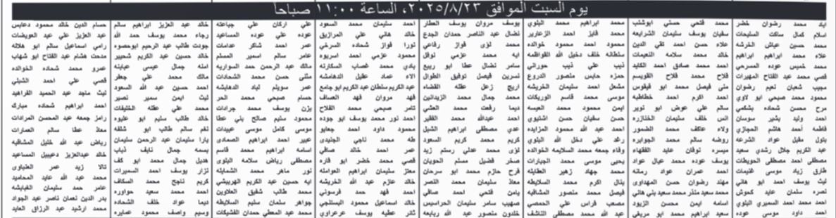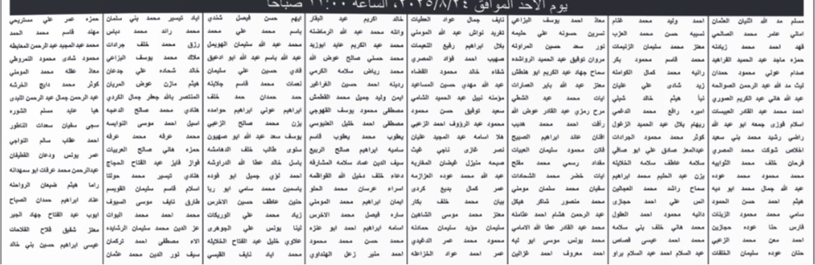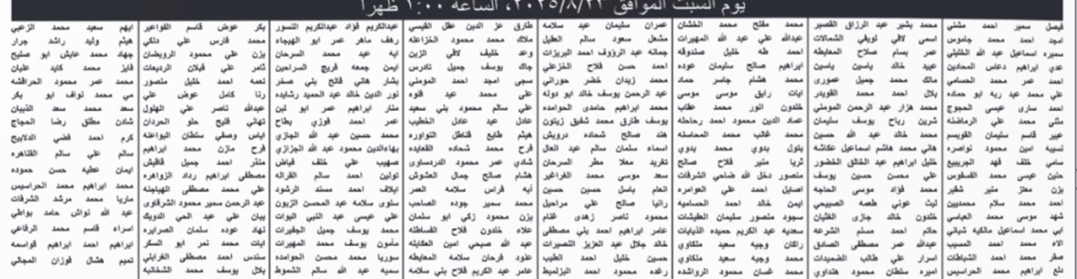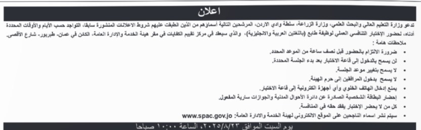 دعت وزارة التعليم العالي والبحث العلمي، ووزارة الزراعة، وسلطة وادي الأردن، اليوم الخميس، المرشحين التالية أسماؤهم إلى التواجد حسب الأيام والأوقات المحددة أدناه، لحضور الاختبار التنافسي العملي لوظيفة "طابع".