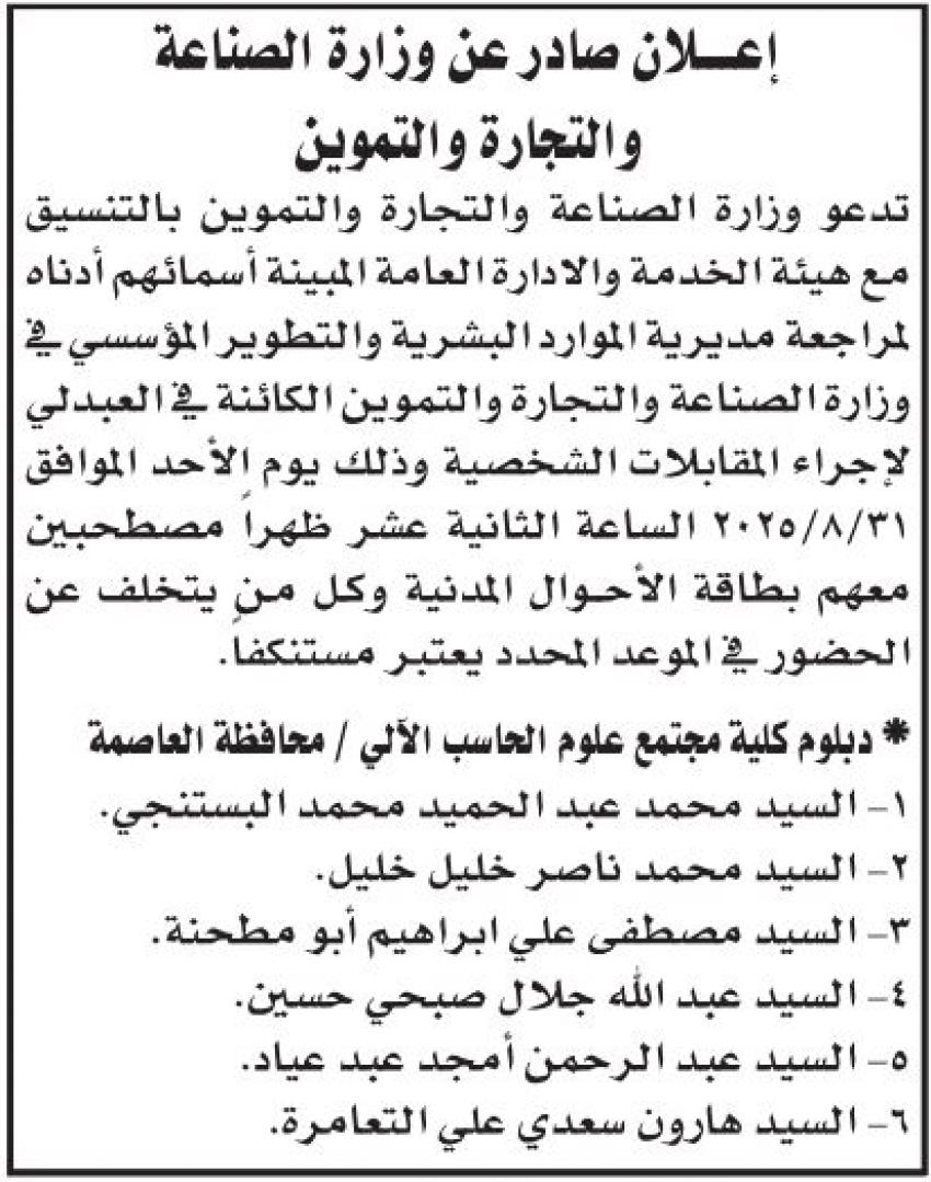 أعلنت وزارة الصناعة والتجارة والتموين عن اسماء المدعوين لاجراء المقابلات الشخصية استكمالا لاجراءات التعيين.