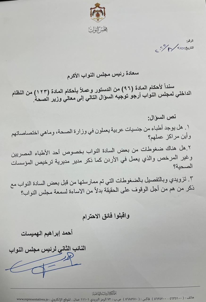جفرا نيوز - وجه النائب احمد هميسات اسئلة لوزير الصحة حول وجود اطباء من جنسيات عربية يعملون في الوزارة؟.