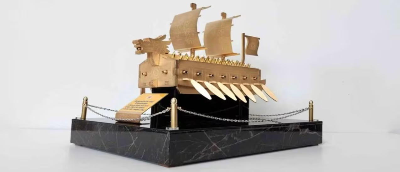 وقال مكتب لي إن نموذج "سفينة السلحفاة" لونه ذهبي ويُشبه السفينة الحربية التاريخية الشهيرة، ويهدف إلى إبراز تميز مهارات بناء السفن في كوريا الجنوبية، التي تجمع بين الأصالة والمعاصرة.