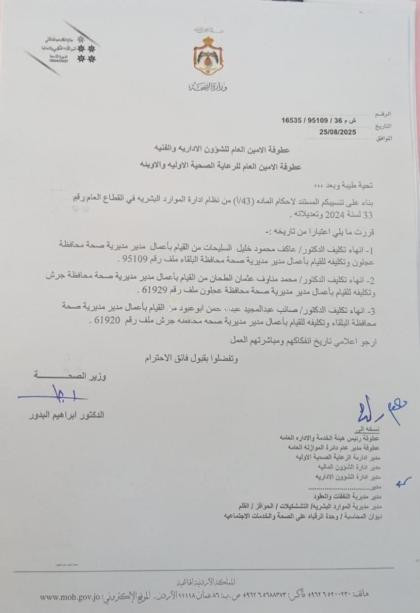 قرر وزير الصحة الدكتور إبراهيم البدور إجراء تشكيلات إدارية محدودة بين كبار الموظفين، تضمنت تعيين مدراء لصحة محافظات البلقاء وعجلون وجرش.