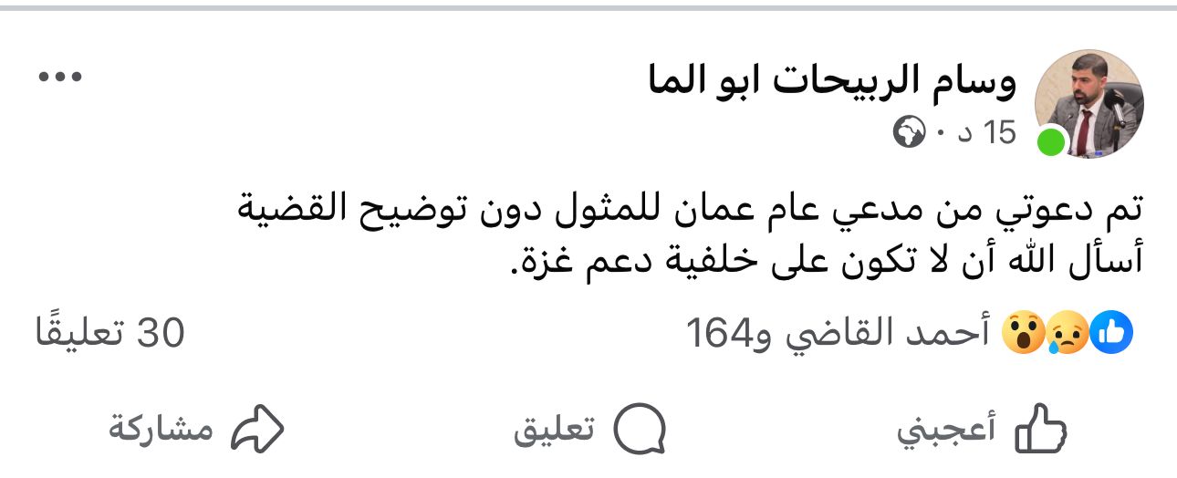 أكد النائب في حزب جبهة العمل الإسلامي وسام الربيحات، اليوم الثلاثاء، أنه تمت دعوته من قبل مدعي عام عمَّان للمثول دون توضيح القضية.