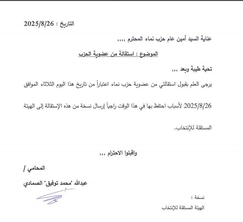 ووجه الصمادي كتاب استقالته الذي حصلت " جفرا نيوز " على نسخة منه إلى أمين عام حزب نماء، راجيًا إرسال نسخة منها إلى الهيئة المستقلة للانتخاب.