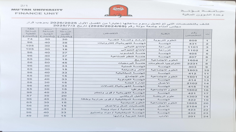 قالت جامعة مؤتة إن قرار رفع رسوم عدد من التخصصات في الجامعة جاء في إطار خطة تطوير أكاديمي شاملة، أعقبت مخاطبة وزارة التعليم العالي بخصوص استحداث 7 تخصصات جديدة، تم إعداد خططها الدراسية وتحديد رسومها باعتبارها برامج مستحدثة.
