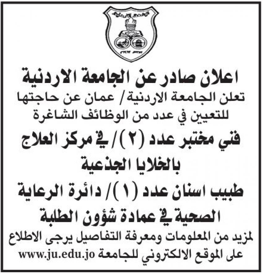 أعلنت الجامعة الأردنية - عمان عن حاجتها لتعيين فني مختبر (عدد 2) في مركز العلاج بالخلايا الجذعية، وطبيب أسنان (عدد 1) في دائرة الرعاية الصحية بـعمادة شؤون الطلبة.
