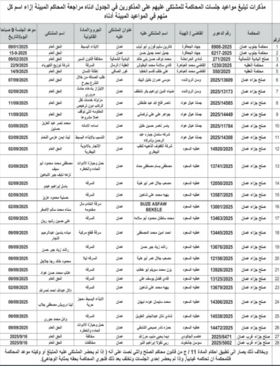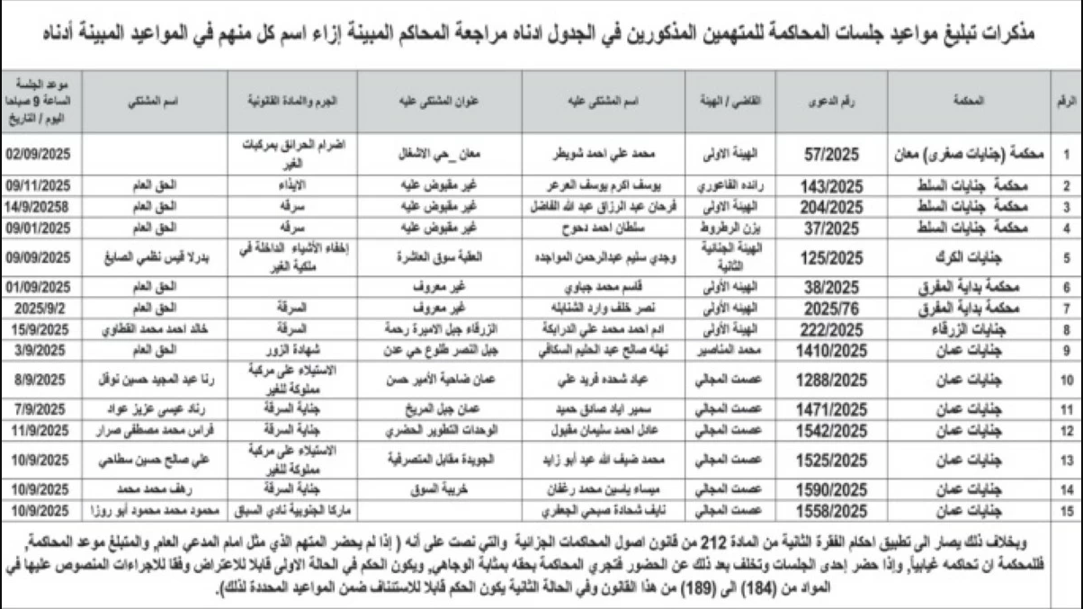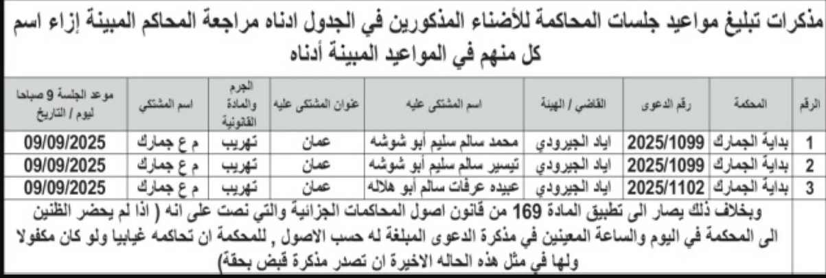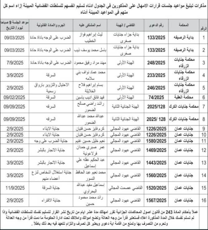 صدرت اليوم الاثنين، مذكرات تبليغ مواعيد جلسات المحاكمة لمشتكى عليهم ولمتهمين وقرارات امهال لحضور جلسات محاكمة.وطلبت المذكرات من المذكورين في الجداول أدناه مراجعة المحاكم المبينة ازاء اسم كل منهم في المواعيد المبينة أدناه.وتاليا الأسماء والمواعيد: