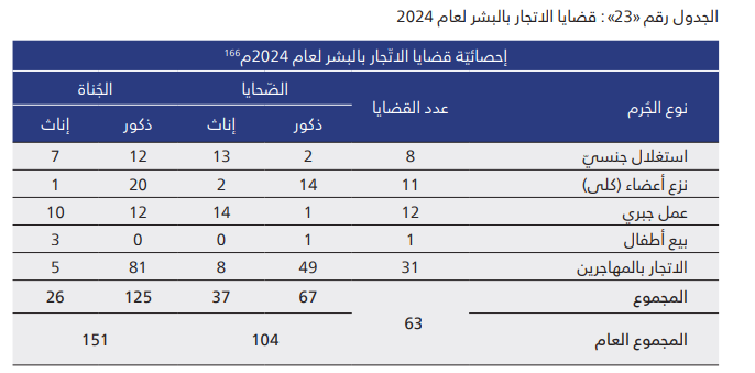 بلغ عدد قضايا الاتجار بالبشر 63 قضية العام الماضي، بحسب ما كشفه تقرير المركز الوطني لحقوق الإنسان للعام 2024.