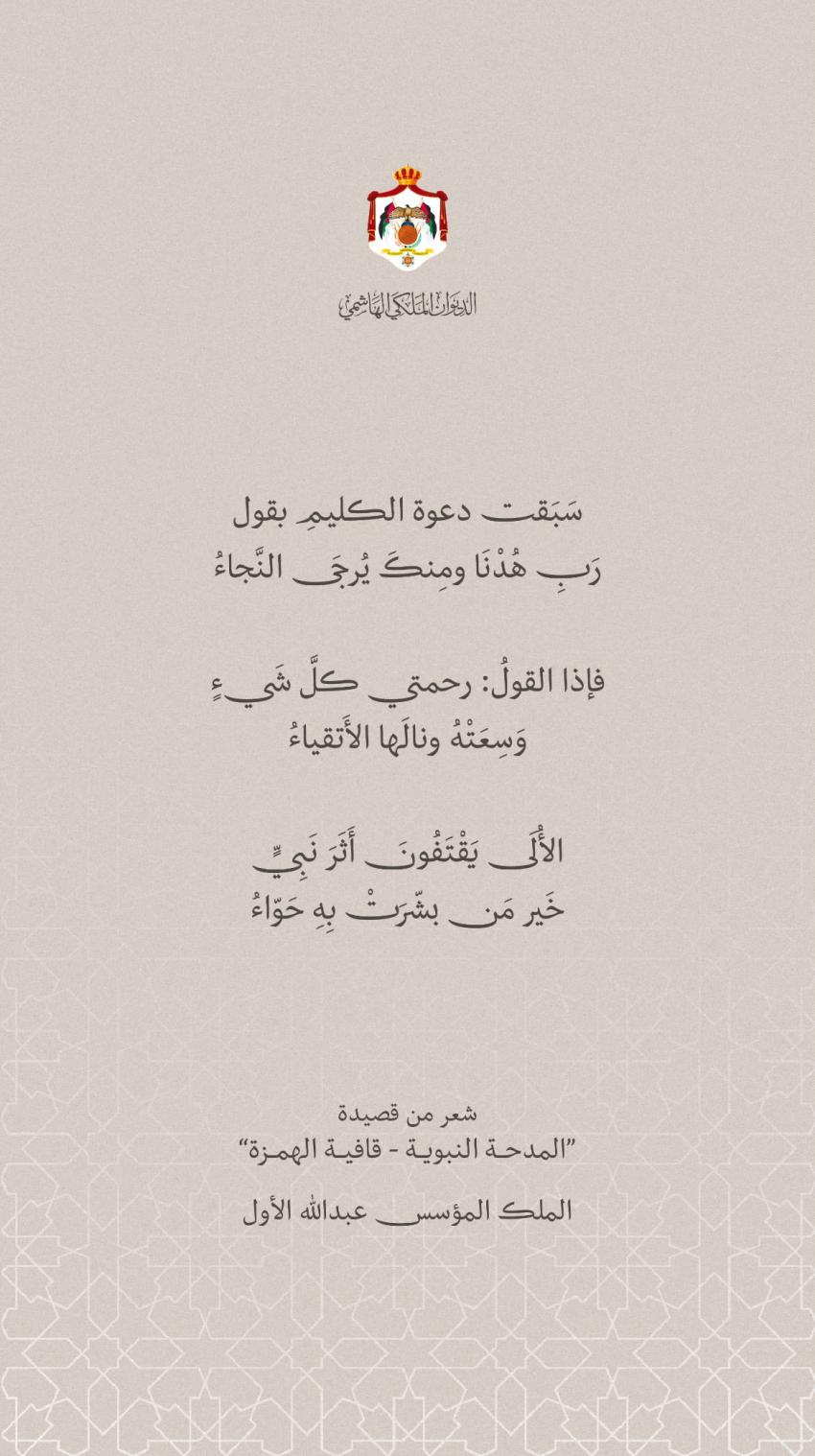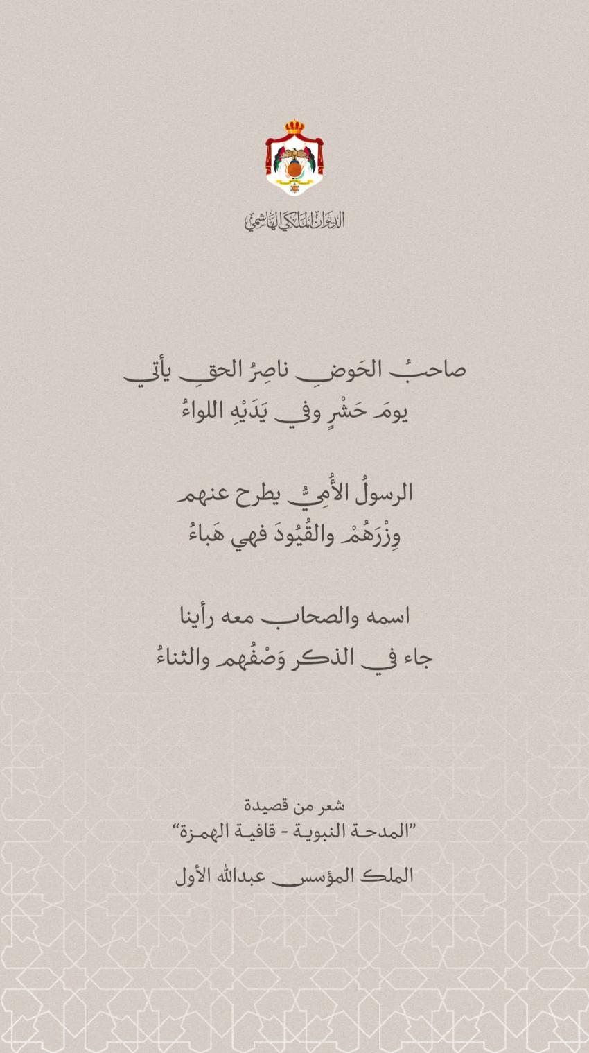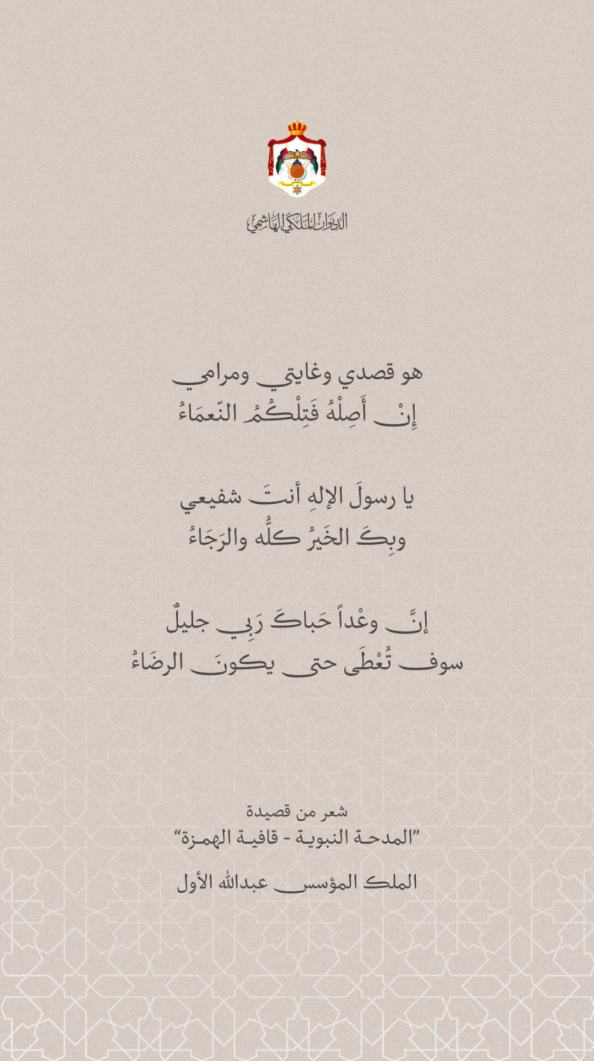 نشر الديوان الملكي الهاشمي، ينشر عبر إنستغرام، شعرا من قصيدة "المدحة النبوية - قافية الهمزة" للملك المؤسس عبدالله الأول.