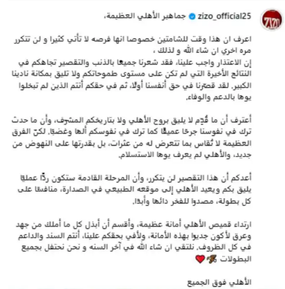 وكان زيزو وجه رسالة مطولة إلى جماهير الأهلي عبر حسابه على "إنستغرام"، أعرب فيها عن شعوره بالمسؤولية تجاه تراجع النتائج الأخيرة، مؤكدا أن الفريق لم يظهر بالشكل الذي يليق بتاريخ النادي وطموحات مشجعيه.