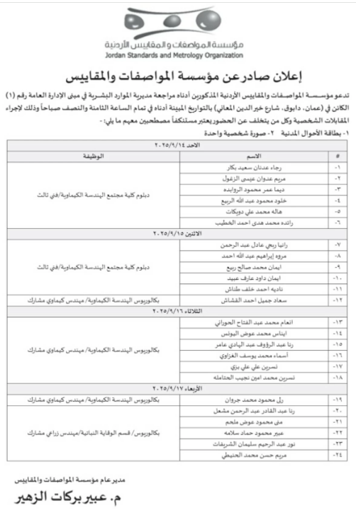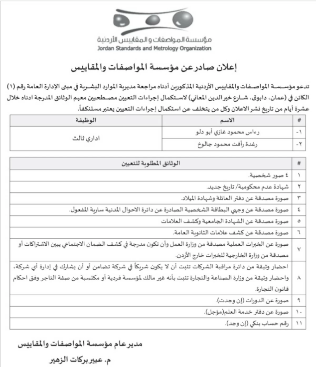 تدعو المؤسسة العامة للمواصفات والمقاييس المذكورين أدناه مراجعة مديرية الموارد البشرية في مبنى الادارة العامة رقم ( 1 ) الكائن في دابوق - شارع خير الدين المعاني لاستكمال اجراءات التعيين مصطحبين معهم الوثائق المدرجة أدناه خلال عشرة ايام من تاريخ نشر الاعلان وكل من يتخلف عن اجراءات التعيين يعتبر مستنكفا.
