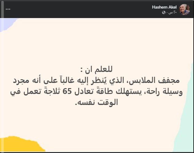وقال عقل في منشور له عبر صفحته الشخصية لعى مواقع التواصل الاجتماعي " فيسبوك ": للعِلم مجفف الملابس، الذي يُنظر إليه غالباً على أنه مجرد وسيلة راحة، يستهلك طاقةً تعادل طاقة 65 ثلاجة تعمل في الوقت نفسه".