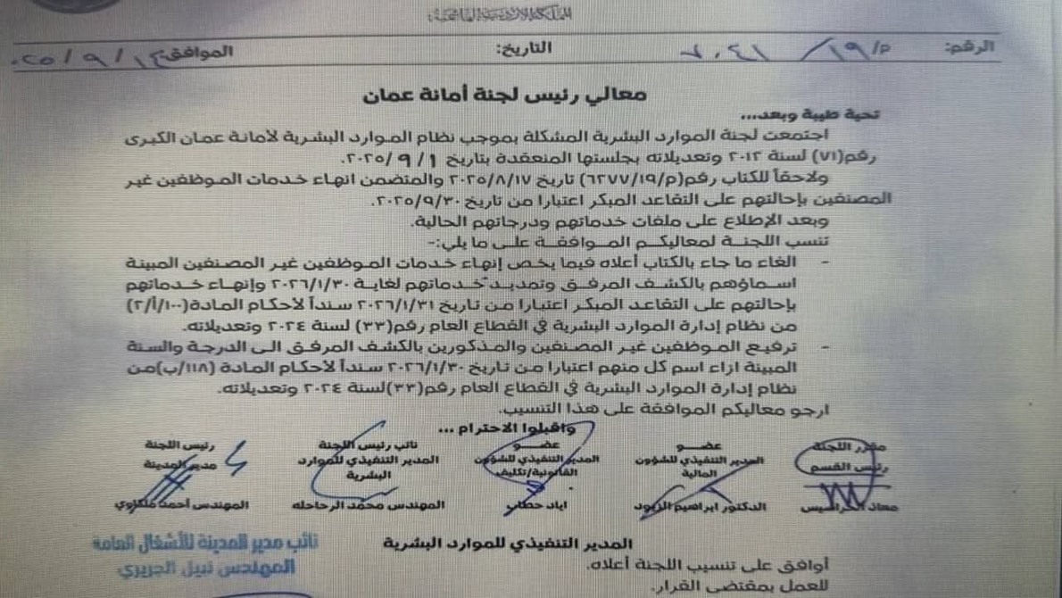 وافق رئيس لجنة امانة عمان الكبرى الدكتور يوسف الشواربة على إلغاء انهاء خدمات 44 موظفا وتمديد خدماتهم لغاية 30/1/2026 على ان يتم احالتهم الى التقاعد المبكر اعتبار من تاريخ 31/1/2026.