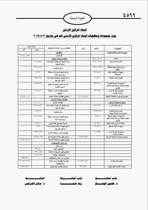 نشر البنك المركزي بيانًا أُدرج في الجريدة الرسمية، اليوم الثلاثاء، تضمن موجودات ومطلوبات البنك كما هو بتاريخ 31-8-2025.