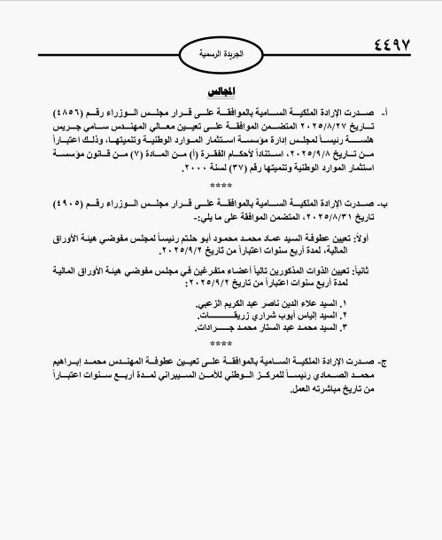 وشملت الإرادة الملكية بحسب ما ورد في الجريدة الرسمية، اليوم الثلاثاء، تعيين عماد أبو حلتم رئيسًا لمجلس مفوضي هيئة الأوراق المالية، وتعيين علاء الدين ناصر الزعبي و إلياس أيوب زريقات و محمد عبد الستار جرادات، أعضاء متفرغين في مجلس مفوضي هيئة الأوراق المالية.